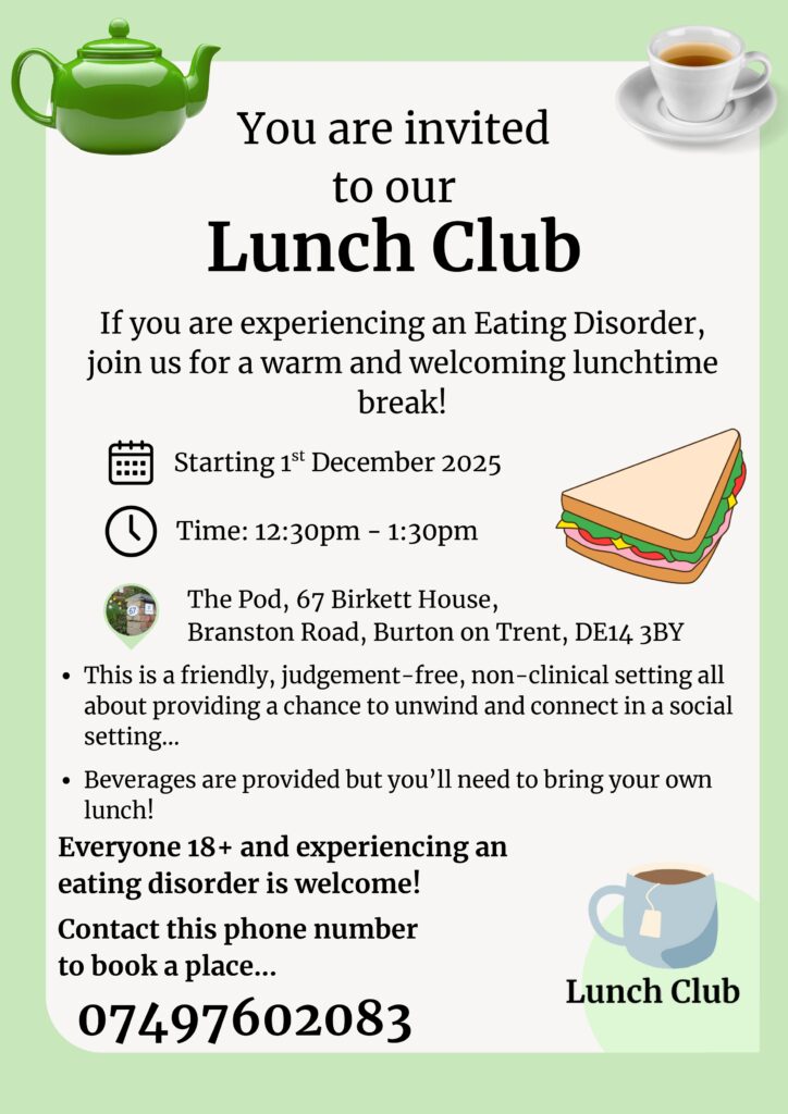 This groups aim is to encourage these people to come together in a social nonclinical setting to eat their own lunch as this is often the first meal that people stop eating. Groups like this have been successful in other areas, so hopefully even if one person attends it may help them. It is free to attend and hopefully would become peer supported.